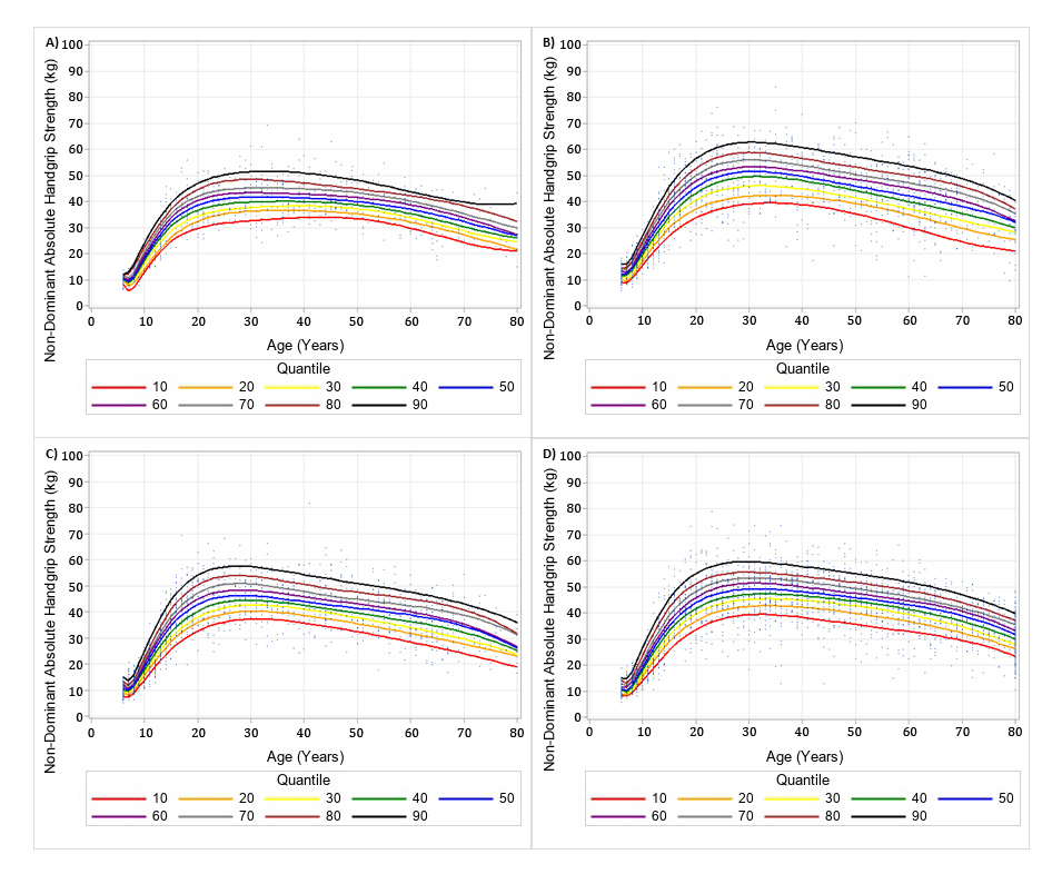 Statistical AnalysisAll analyses were conducted with SAS 9.4 software (SAS Institute; Cary, NC, USA). Parametric quantile regression models were run to generate absolute HGS and HGS normalized to BMI growth charts for the 10th–90th percentiles by gender and ethnicity for Americans aged 6–80 years. The same procedures were also performed for HGS data from the dominant and non-dominant hands. These 10 quantiles were pre-specified by investigators to bolster the interpretability of the results in the free-living environment. Fitted values for absolute HGS and HGS normalized to BMI were estimated at each ascertained age. Utilizing parametric quantile regression to create growth curves allows the models to fit conditional quantiles of strength capacity without assuming a parametric distribution, estimate the entire conditional distribution of the response, and reveal the effects of predictors on various parts of the response distribution, thereby making quantile regression feasible for analyses of datasets with larger amounts of observations such as NHANES [22].