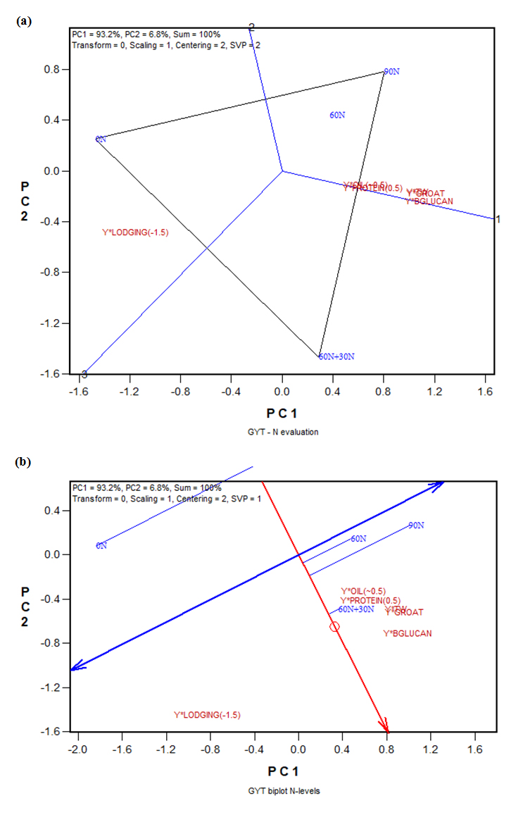 Evaluation of the Nitrogen-Fertilizer Levels Using GT Biplot versus GYT BiplotThe biplot that displays the nitrogen treatment by trait table (not shown) is presented in Figure 4. It shows that the control (0N) had the highest test weight (TW) and lowest lodging score, which are desirable. However, it had the lowest grain yield, groat content, β-glucan concentration, and protein concentration, and the highest oil concentration, which are all undesirable. In contrast, N applications had positive effects including increased yield, groat, β-glucan, and protein and reduced oil, but adverse effects including reduced test weight and increased lodging. These results are consistent with earlier N-fertilizer studies on oat [5,9,10]. So, it is important to find a N treatment or management package so as to maximize the positive effects and minimize the negative effects of nitrogen fertilizer.