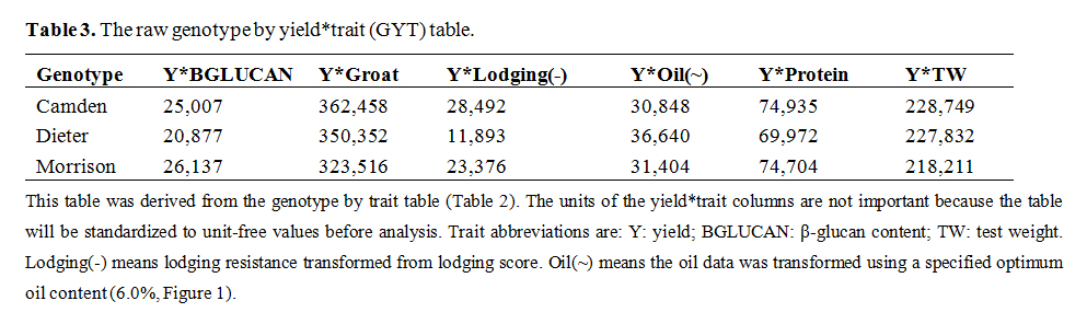 Step 1: convert the GT table (Table 2) to a raw GYT table (Table 3). In the GYT table each column is a yield-trait combination. For traits that were so measured that a larger value means more desirable, the yield-trait combination was denoted as “Y*Trait”. For example, the “Y*TW” column contains values from multiplying the yield value (Y) with the test weight value (TW) for each genotype. For traits that were so measured that a larger value means less desirable, the yield-trait combination is denoted as “Y*Trait(-)”, e.g., Y*Lodging(-). The Y*Lodging(-) values were calculated as follows. The lodging score was first transformed to “lodging resistance” such that all genotypes had non-negative values and a larger score means better lodging resistance. Specifically, the transformation was conducted by: Xi = Max + Min − xi, where xi and Xi are the original lodging score and the transformed lodging resistance for genotype i, respectively, and Max and Min are the maximum and minimum lodging scores, respectively. The transformed values are then multiplied with the yield value to obtain the “Y*Lodging(-)” value for each genotype. There may be traits that have an optimal value. For example, although the milling oat industry requires oat oil concentration to be lower than 8.0%, it is not necessarily the lower the better; an oil concentration of 6.0%, say, may be considered as optimal. So the yield-oil combination was denoted as “Y*Oil(~)” and the transformation was done by Xi = Max − |xi − Opt|, where Opt is the optimal value for the trait. This transformed value was then multiplied to the yield value to form the “Y*Oil(~)” values for each genotype. Micronaire index in cotton is another example trait that has an optima value (round 4.0) [7]. The data transformations guarantee that in the GYT table a larger value always means more desirable. The units in the GYT table are not important since the data will be standardized before genotype evaluation.