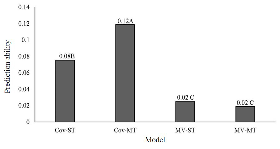 Figure 3. Mean prediction ability across all genomic selection scenarios for grain yield using partial least square covariate (Cov) and multivariate (MV) regression models in the presence of single (ST) and multiple (MT) traits collected from high-throughput phenotyping. Prediction scenarios included cross-validations and independent predictions. Means followed by the same letter are not significantly different, LSD < 0.05.