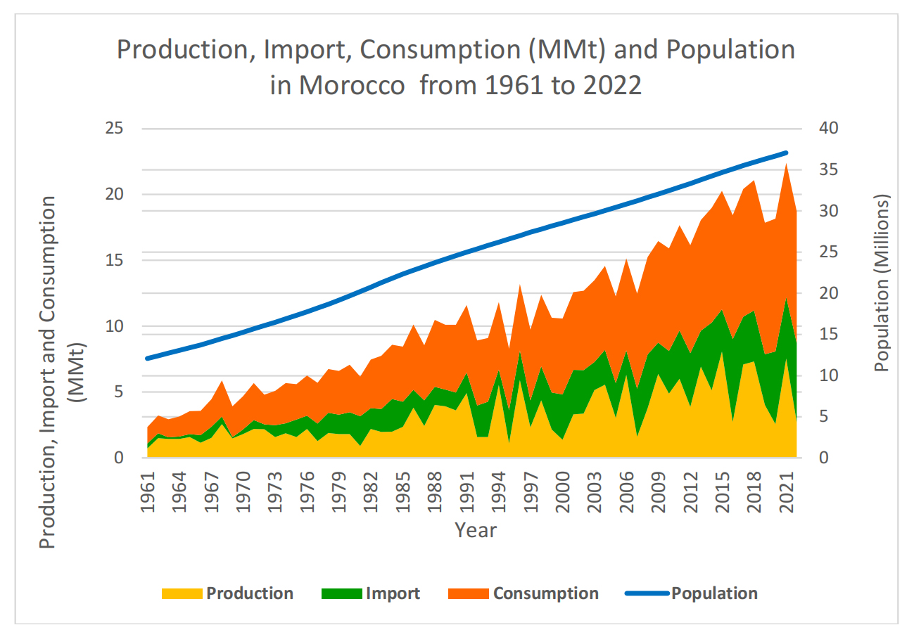 Wheat production and population in Morocco have increased from 0.72 million tons and 12.1 million people in 1961 to 7.5 million tons and 37 million people in 2021 (Figure 1). Similarly, wheat consumption has been increasing steadily, especially during the past 20 years, because of a growing population, changing food preferences and growing urbanization. Morocco imports more than 60% of its wheat needs on an annual basis. On average, Morocco imports 3 million tons per year to satisfy the demand for national food security. In 2022, however, Morocco imported more than 6 million tons of wheat due to the very low national wheat production associated with extreme drought during the season [3].