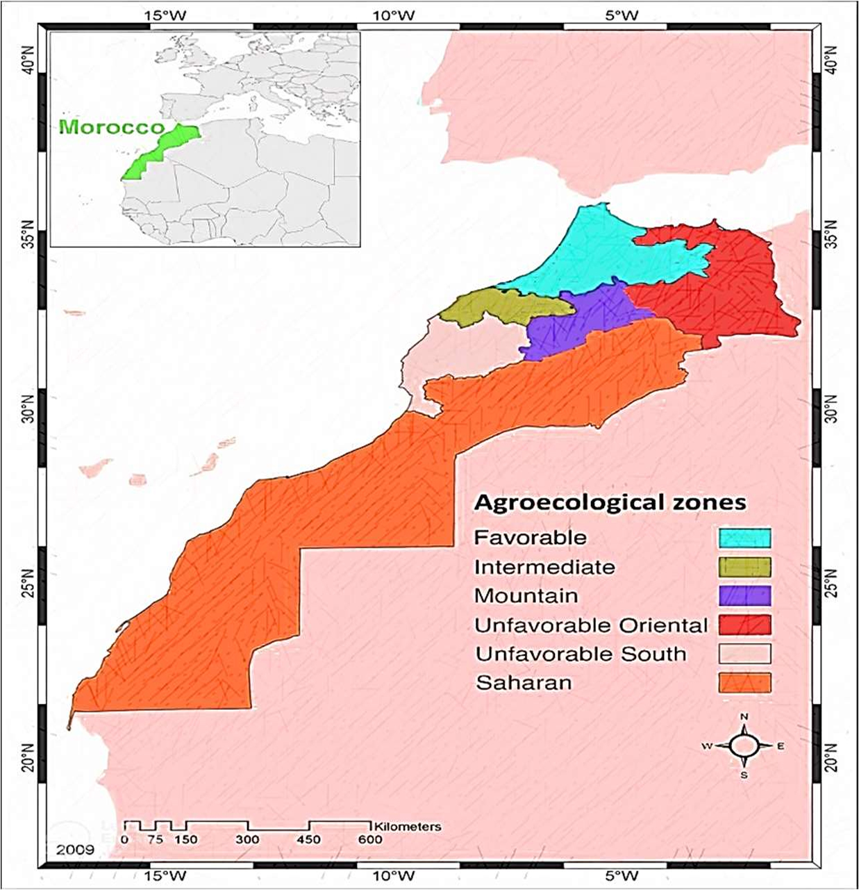 Production systems and agro-ecologies could be classified considering different factors such as rain fall and water source and availability, temperature, vegetation cover, altitude, soil type and other factors. In Morocco, based on the source of water for crop production, the wheat production system could be classified into rainfed and irrigated wheat production systems. The rainfed production system accounts about 92% of the wheat production area and 85% of the total wheat production which makes it the most dominant system in Morocco [3]. Based on rainfall distribution, temperature gradient and altitude, the agro-ecological regions in Morocco could be grouped into: