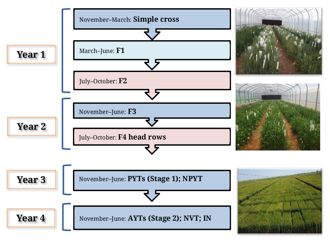 Modified shuttle breedingThis method involves rigorous screening and assembling parents into crossing blocks, generation of simple and top crosses using two cycles in the plastic/greenhouse, two cycles of generation advancement in the field at Merchouch station involving the main winter season (November–June) under rainfed conditions and summer season (July–October) using drip irrigation (Figure 5). Under this scheme, pedigree selection is employed at F2, F3 and F4 generations. The selected F4 head rows are promoted to preliminary yield trials (PYTs) to be tested across locations using augmented designs for a period of 1 year. The selected genotypes from stage 1 trials (PYT) are tested further across locations under the Advanced yield trial (AYT) for 1 year using alpha lattice design in two replications. A copy of the stage 2 trials (AYT) is also multiplied in non-replicated large plots of 6 m2 at the same time for clean seed production. Rouging of seemingly segregant/off type plants and cleaning of seeds after harvesting will be carried out intensively. It takes only 4 years from crossing to the distribution of elite germplasm to national programs using this scheme [17].