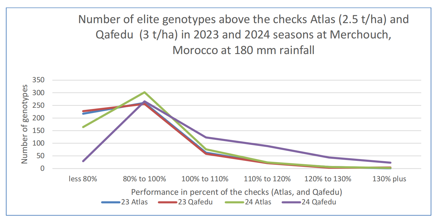Breeders have used different data sets and analytical packages to determine the rate of breeding progress for their respective breeding programs. Regression analysis using the top 5 high-yielding varieties with the trial mean has been used to determine the rate of breeding progress [18]. Breeders also used relative performance calculated as percent of the best checks to show the genetic gain/breeding progress in a year or across years. As indicated in Figure 6, the performance of elite spring bread wheat genotypes from ICARDA’s bread wheat breeding program was determined in percent of the best checks, Qafedu and Atlas during 2023 and 2024 seasons at Merchouch station, Morocco. The two consecutive years (2023 & 2024) were dry seasons with a 200 mm average amount of rainfall during each growing season, and the two best checks, Qafedu and Atlas, gave average yield levels of 3 and 2.5 t/ha, respectively (Figure 6). Under this very low moisture level (200 mm), there were more than 200 lines which performed above 100% of the checks with actual yield levels of up to 4.5 t/ha, showing the presence of high-yielding and drought tolerant wheat genotypes with clear genetic gain/breeding progress as compared to the best check varieties in the program.
