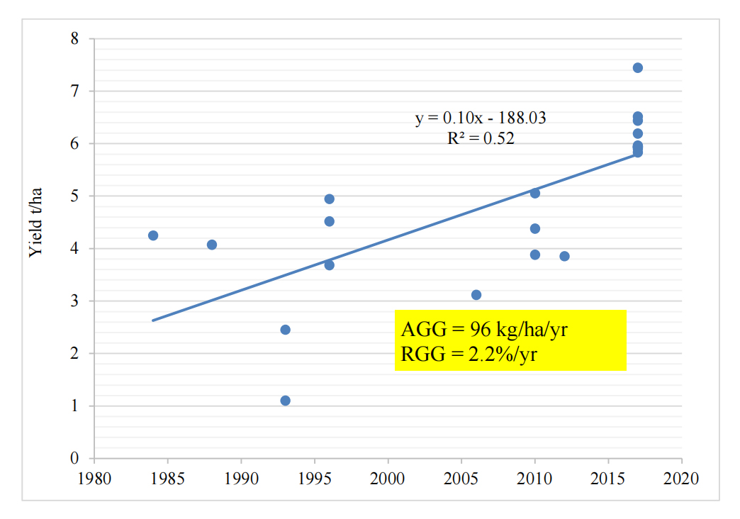 Previously, genetic gain analysis for bread wheat varieties released from 1980 to 2017 was determined by growing them at Merchouch station in Morocco for two seasons and regressing the yield of the varieties by their corresponding year of release, as indicated in Figure 7. The result showed that the relative genetic gain (RGG) has increased by 2.2% while the absolute genetic gain (AGG) has increased by 96 kg/year.