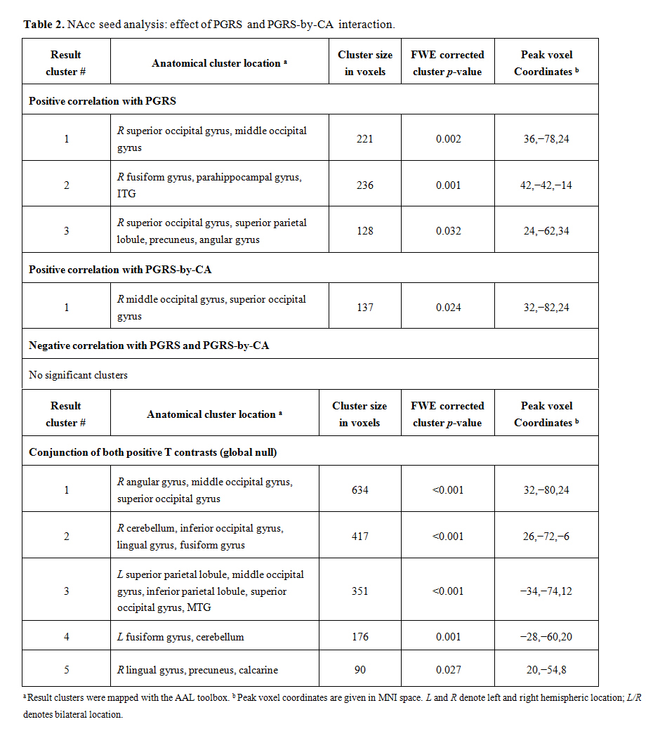 NAcc seed analysis was used to dissect if the PGRS and CA-by-PGRS effects on FCD stem from specific brain areas. Here, the bilateral NAcc seed showed positive correlation with the PGRS in the right middle/superior occipital gyrus and middle temporal and parahippocampal gyrus (Table 2). The PGRS-by-CA interaction mapped to an occipital cluster (pcluster.FWE = 0.024) exactly co-localizing with the PGRS effect. The conjunction of both contrasts mapped to six clusters with a bilateral occipito-parietal distribution that were non-overlapping with the normative positive and negative NAcc connectivity network (Figure 1).