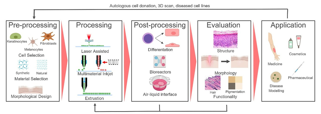 Figure 2. Skin bioprinting pipeline. (Pre-processing) Cells are chosen for the application and are cultured in vitro to reach a sufficient cell number. Bioinks made of a variety of synthetic and natural polymers are available, and the choice depends upon the application. The 3D design of the printed skin is determined. For wound healing, the skin can be printed to be complementary to the wound. (Processing) Using one of the available printing approaches, the skin construct is printed. The choice will be influenced by the desired properties of the final construct. (Post-processing) Further processing may be required before the skin is ready for use, such as differentiating stem cells, growing in a bioreactor, or maturing cells in an air-liquid interface. (Evaluation) The construct is evaluated before application. This may include analysis of structure, morphology, and function. Some applications may require iterations of these three steps—processing, post-processing, and evaluation. (Application) The construct is used in its intended application, such as wound treatment, in vitro disease modeling, cosmetic testing, and pharmaceutical testing.